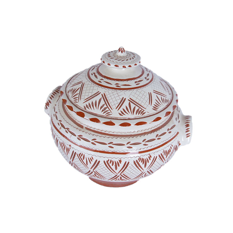تصميم الإناء يجمع بين الجمال الوظيفي والزخارف الفنية التي تضفي عليه لمسة من التراث الأصيل. سواء كنت تستخدمه لتقديم الأطعمة الساخنة أو حفظ المأكولات، فإن إناء خزف يضفي جاذبية خاصة على طاولتك.