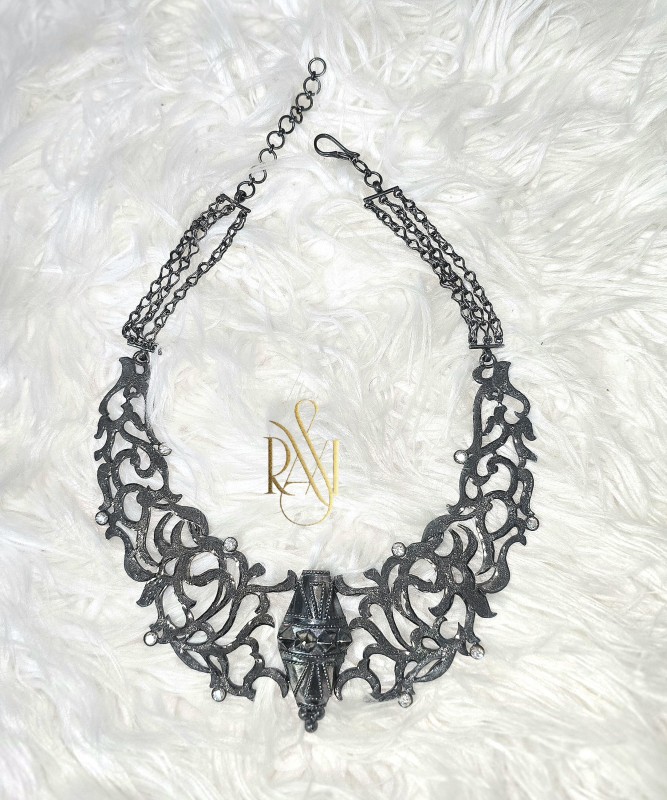 قلادة من الفضة العمانية . معتقة بمادة خاصة بالتعتيق. صنعت يدويا بتفريغ زخرفة نباتية وإضافة الزيركون.